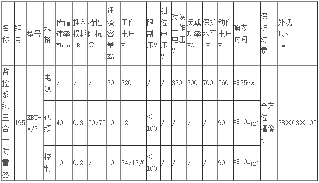KBT-V3三合一防雷器根據(jù)監(jiān)控系統(tǒng)的特點量身打造的專用防雷設(shè)備,它集電源防雷器、視頻線路防雷器和控制線路防雷器于一體,各部分均采用多級串聯(lián)式結(jié)構(gòu)設(shè)計,具有多級保護功能。適用于公共場所、各種樓宇、機場、海關(guān)、軍事基地等各種重要安防設(shè)施的室內(nèi)、室外監(jiān)控攝像槍的防雷擊電磁脈沖保護。三合一防雷器用于帶云臺攝像槍,安裝在監(jiān)控系統(tǒng)前端的攝像機尾部,位置與攝像機越近越好,并做好接地處理,接地電阻應(yīng)符合標準的要求。