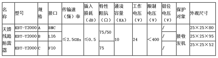 KBT—T系列天饋線路防雷器根據(jù)不同饋線設(shè)備的具體情,采用不同的設(shè)計原理,能較好地滿足各種類型設(shè)備的防雷要求,具有通流容量大,限制電壓低,駐波比小等特點。適用于通信、廣播電視、計算機網(wǎng)絡(luò)饋線、導(dǎo)航、閉路電視、監(jiān)控系統(tǒng)及其他各種有線設(shè)備和無線發(fā)射、接收設(shè)備的防雷擊電磁脈沖保護。