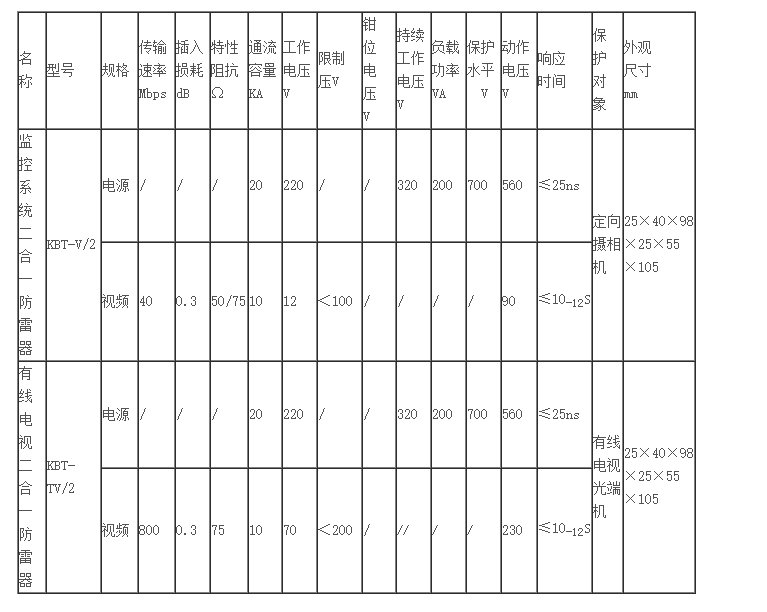 監(jiān)控多功能二合一防雷器是根據(jù)監(jiān)控系統(tǒng)的特點(diǎn)量身打造的專用防雷設(shè)備,它集電源防雷器、視頻線路防雷器和控制線路防雷器于一體,各部分均采用多級串聯(lián)式結(jié)構(gòu)設(shè)計(jì),具有多級保護(hù)功能,適用于公共場所、各種樓宇、機(jī)場、海關(guān)、軍事基地等各種重要安防設(shè)施的室內(nèi)、室外監(jiān)控?cái)z像槍的防雷擊電磁脈沖保護(hù)。KBT—V/2用于不帶云臺(tái)攝像槍。